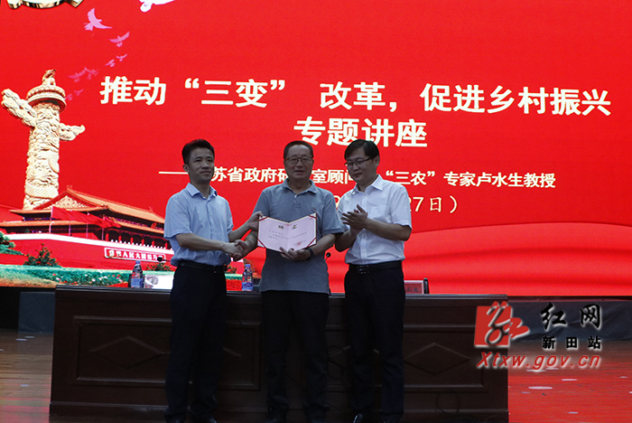 新田新闻网(记者 汤程安 黄斌颖)5月26日至27日,全国农业农村改革专家、江苏省政府研究室顾问、“三农”专家卢水生到新田县调研指导农村“三变”改革工作,并作“推动‘三变’改革 促进乡村振兴”专题讲座。县委副书记、县长秦山成为卢水生教授颁发了《新田县人民政府农村经济发展顾问》聘书。在家的县领导参加专题讲座或陪同调研。