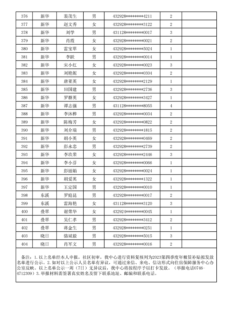 2023年新田县住房保障服务中心第四季度租赁补贴拟发放名单公示