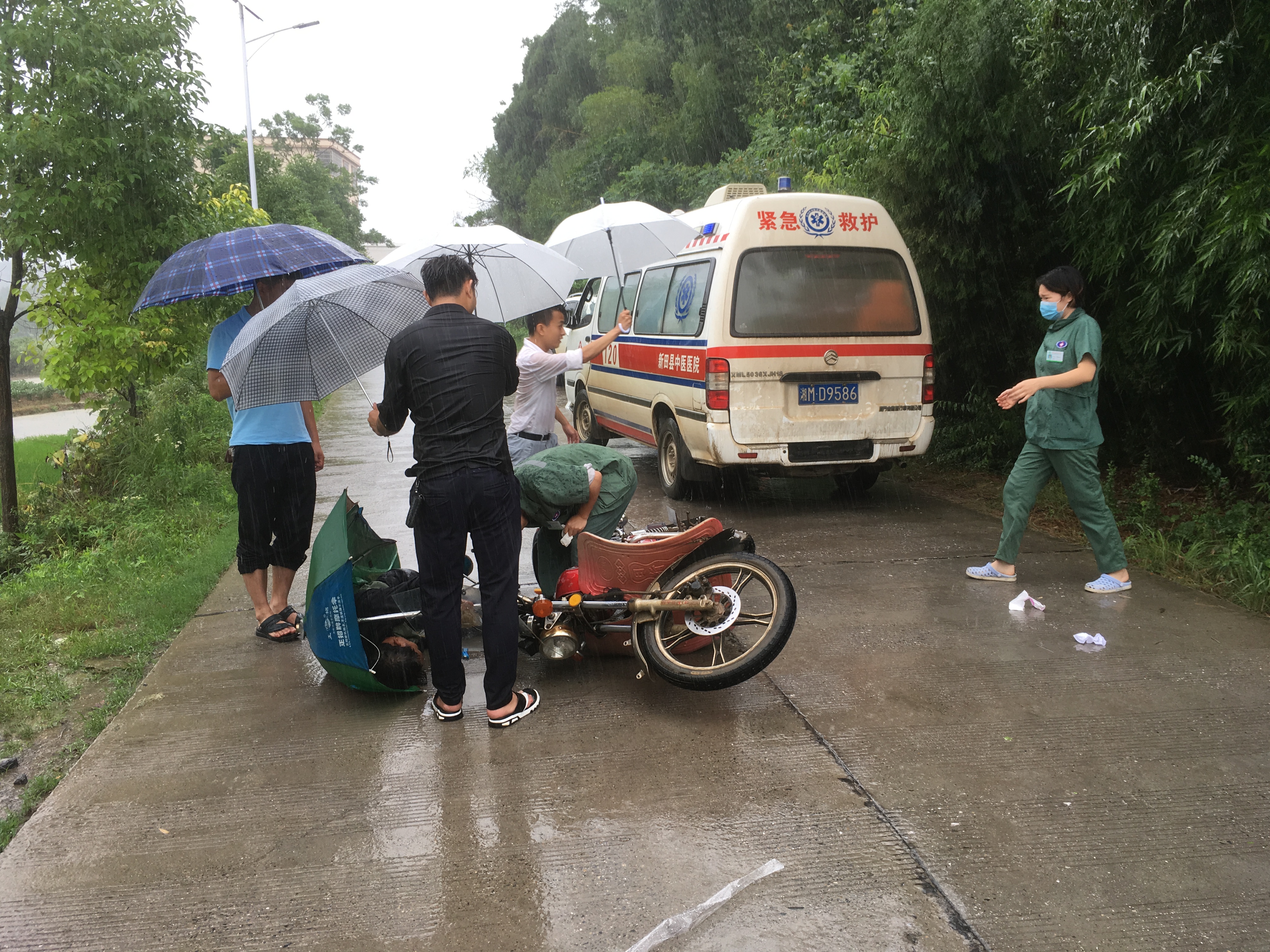 据了解,受伤群众系大坪塘镇大山仁村村民,骑摩托车路过大坪塘中心校路段时,因降雨过大,视线不好,且本人疏忽,在拐弯时车速过快,不慎摔倒造成重伤不能动弹,幸好得到了大家的帮助并及时送至县中医院救治。