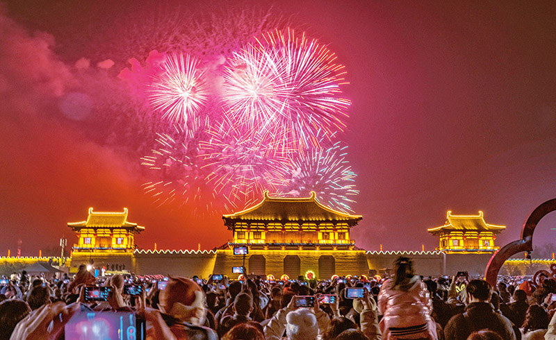 近年来,河南省洛阳市大遗址保护和遗址公园建设亮点突出,一批集空间游玩、非遗体验、沉浸互动等为一体的文化场景次第涌现,优秀文创项目和产品破“圈”而出,让人“心向往之”。图为2023年1月22日,市民在洛阳市洛龙区定鼎门广场观赏焰火晚会。