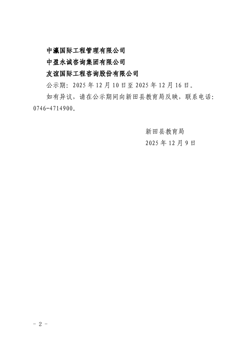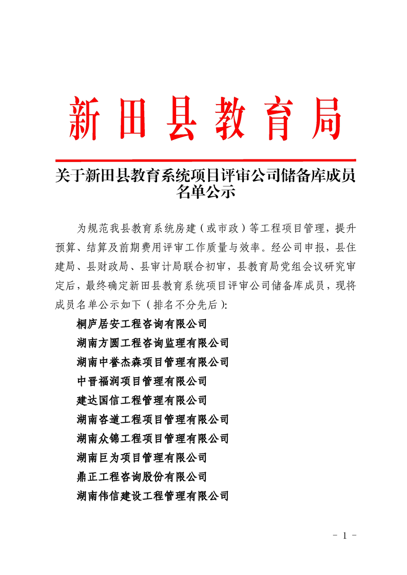 关于新田县教育系统项目评审公司储备库成员名单公示