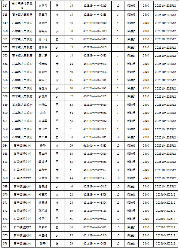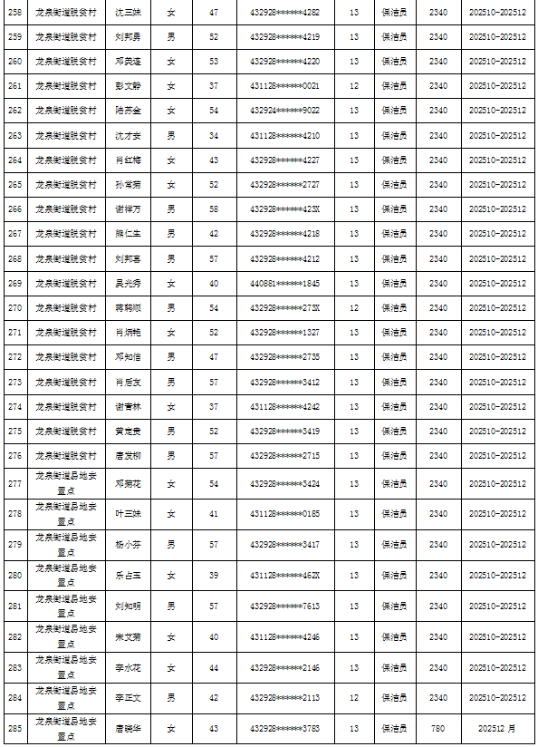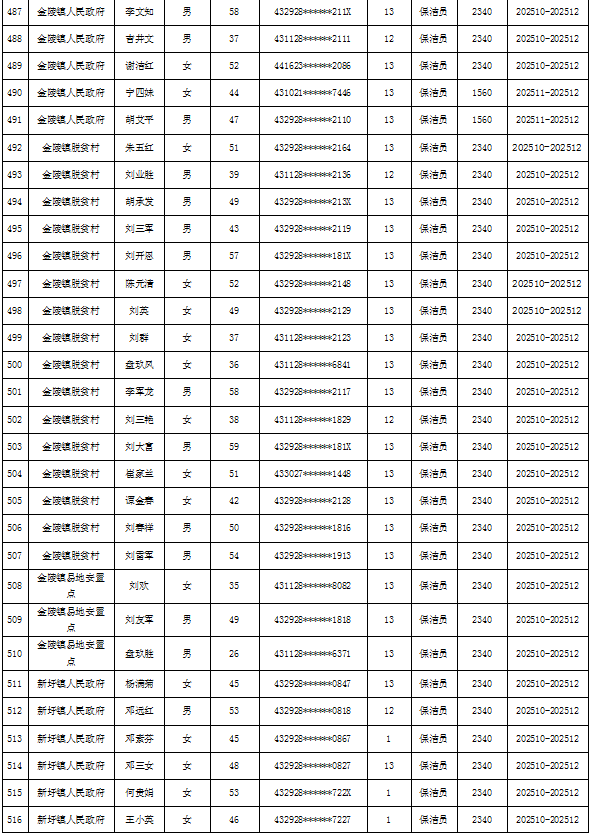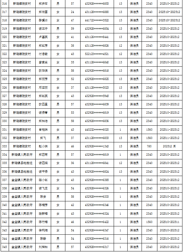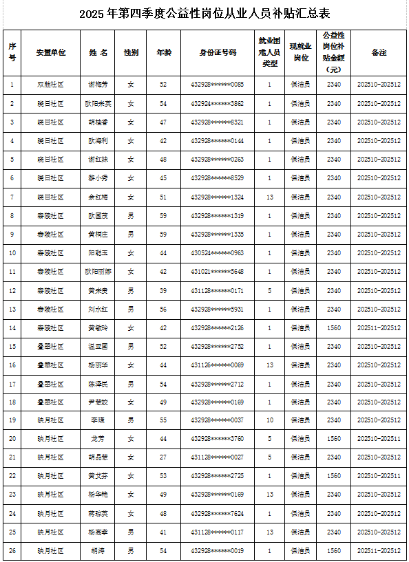 为加强我县公益性岗位监督管理,根据《新田县公益性岗位开发管理经办规程(试行)的通知》(新人联发〔2024〕8号),现将新田县2025年第四季度公益性岗位从业人员补贴名单(见附件)公示,公示期7天。如有异议请向新田县就业服务中心等相关部门反映情况。