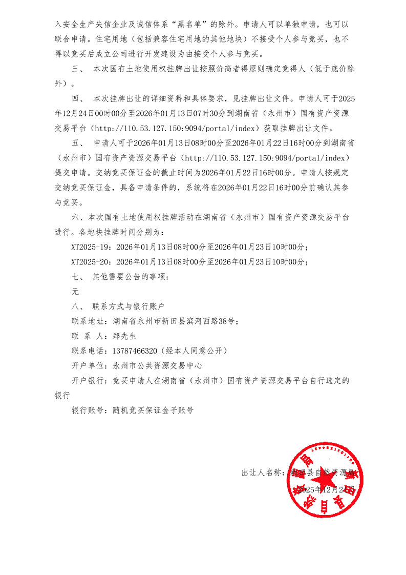 新田县自然资源局国有土地使用权挂牌出让公告新田县国土公告〔2025〕12号