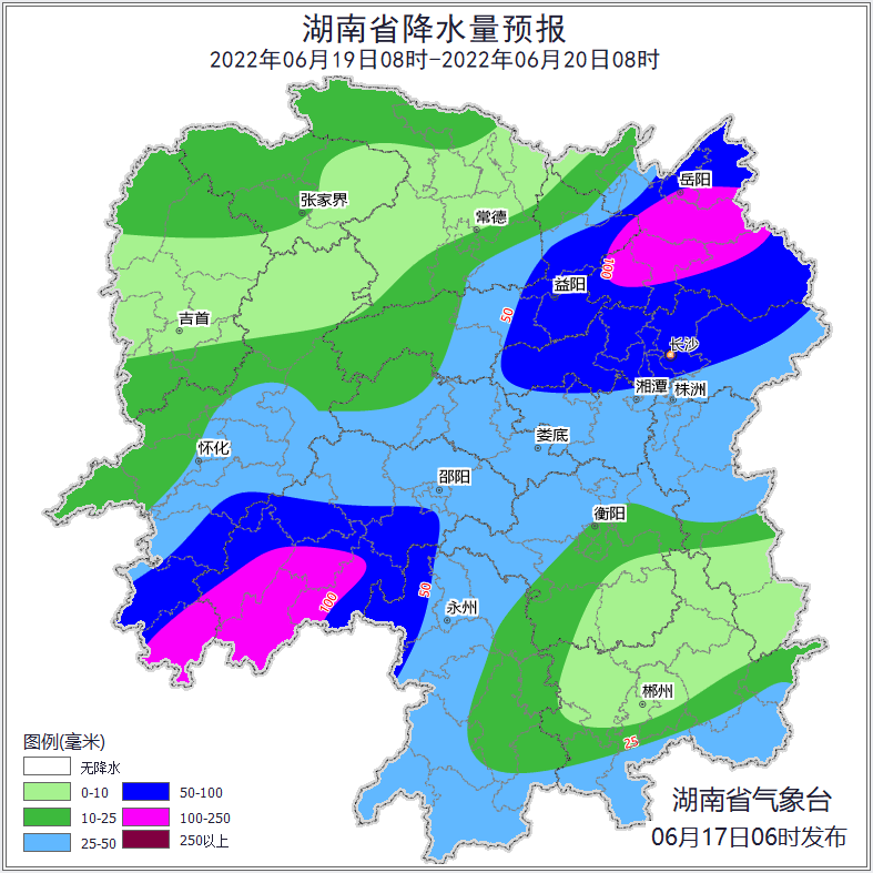 19日,强降雨带维持东北-西南向分布,强度加强。怀化中南部、邵阳、永州北部、益阳东部、岳阳、长沙、湘潭北部有暴雨,其中通道、绥宁、武冈、城步、新宁、岳阳市区、汨罗、湘阴、平江、临湘、沅江有大暴雨到特大暴雨,其他地区有小到中等阵雨或雷阵雨。