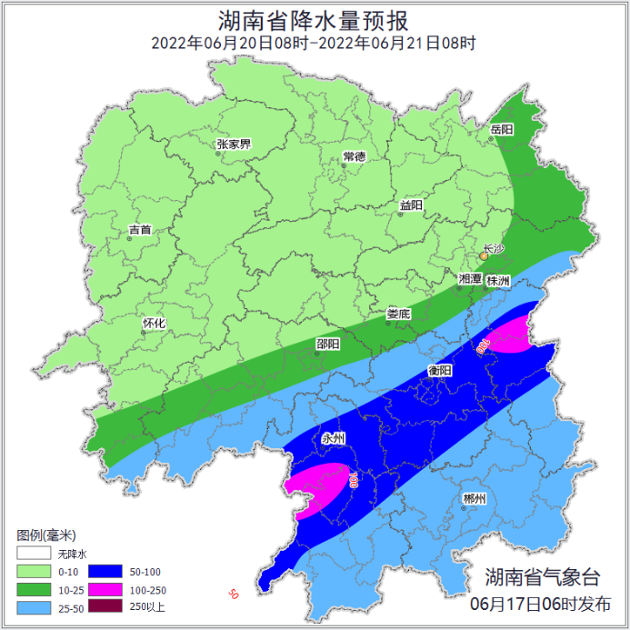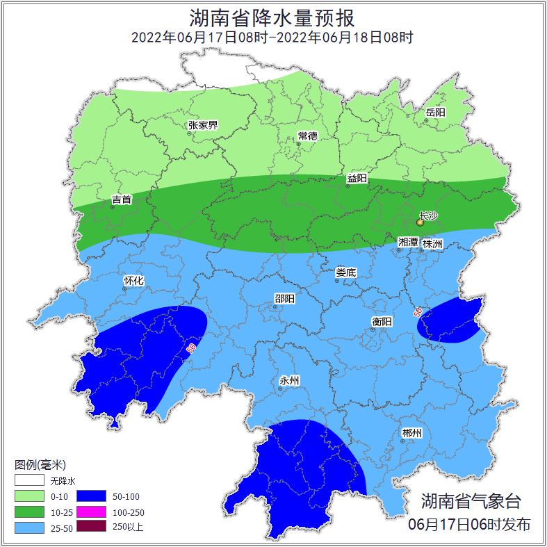 17日,降雨开始发展。湘中、湘南地区有中到大雨,其中怀化中南部、邵阳西部、永州中南部、郴州西部、衡阳东部、株洲中部有暴雨,单点大暴雨,其他地区有小到中等阵雨或雷阵雨。