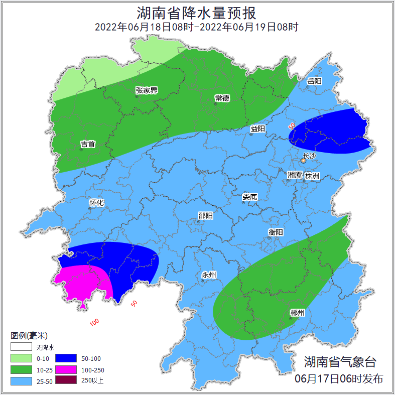 18日,强降雨带北抬,呈东北-西南向分布。全省大部分地区有中到大雨,怀化南部、邵阳南部、长沙东部、岳阳南部部分地区暴雨,其中靖州、通道、绥宁、城步大暴雨。