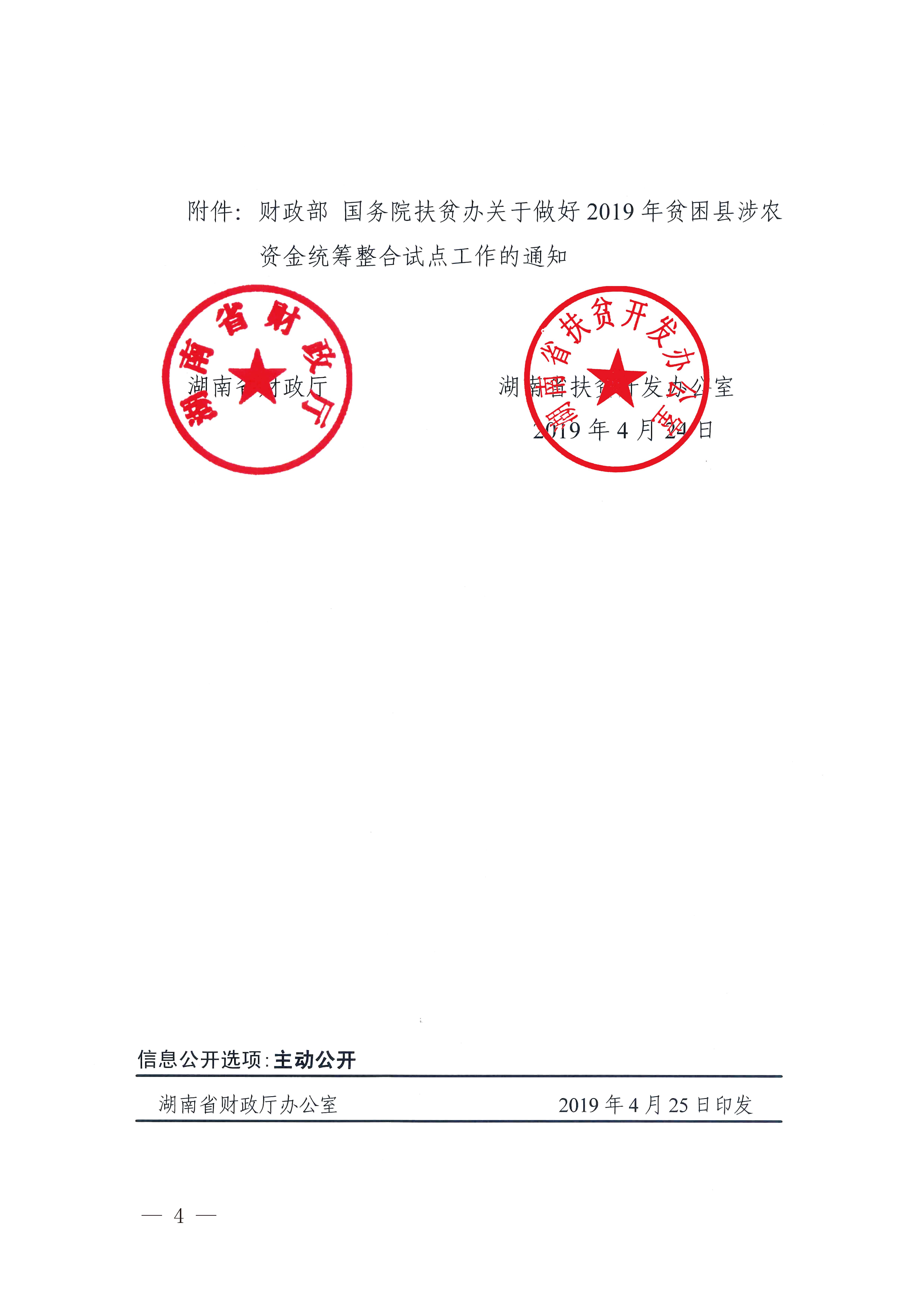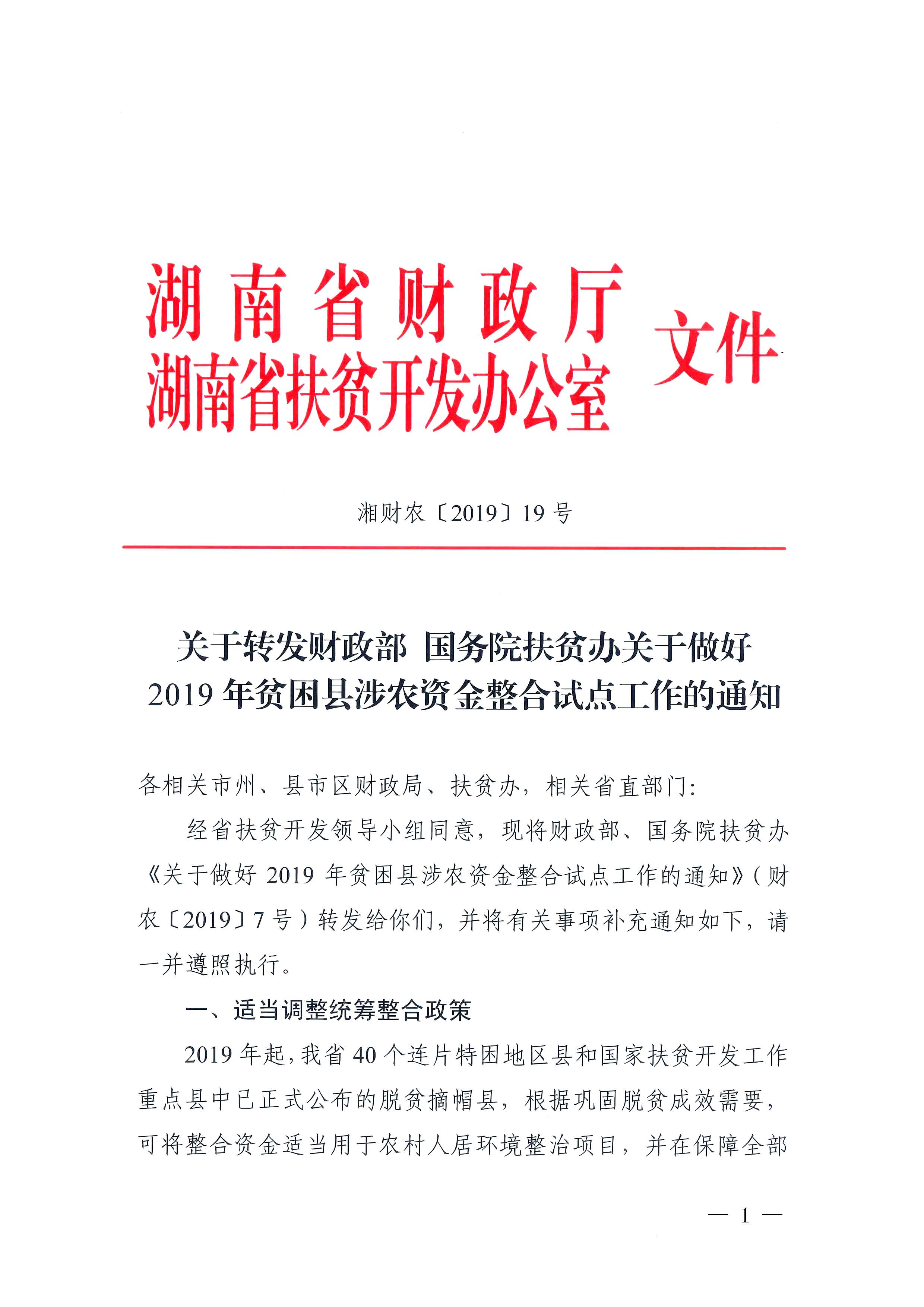 湖南省财政厅 扶贫办 关于转发财政部国务院扶贫办关于做好2019年贫困县涉农资金整合试点工作的通知 湘财农(2019)19号