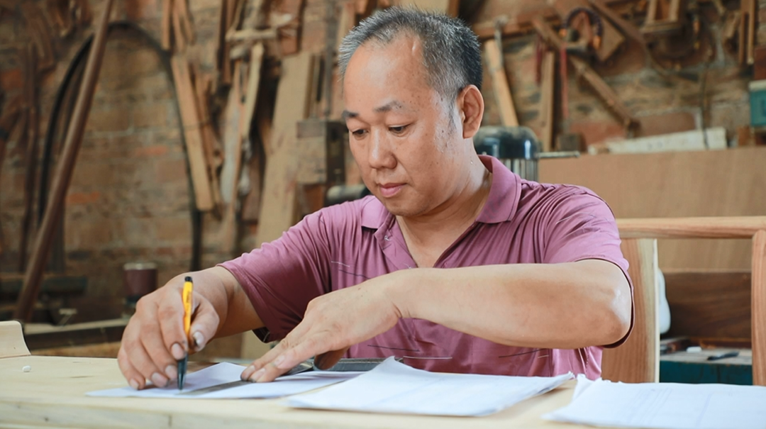 今年56岁的骆怀生,从十几岁开始学木工,后进入广东一家家具厂工作,虽不善言谈,但凭借自身对木工的热爱和勤奋好学,很快掌握了家具制作的整套流程和工艺。2012年,骆怀生在清远开了自己的家具厂,由于制作出来的家具款式精美、质量过硬,短短几年时间内,便在当地市场占有了一席之地。尽管生意越做越大,但随着父母年龄的增长,骆怀生萌生了回乡创业的想法。骆怀生表示,“一方面家里有老人需要照顾,另一方面,我也想把这个手艺带回家乡,能够帮助到更多的人就业增收。”