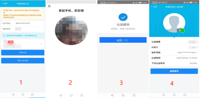 3.进入认证界面,可以为自己认证,也可以为家庭成员认证;首先请正视摄像头,将人脸放入提示框内,并按要求完成动作,将弹出认证结果,如果认证成功,弹出认证成功提示。