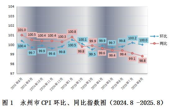 2025年8月份,食品供应总体充足,永州居民消费价格(CPI)同比价格下跌1.2%,环比价格持平。