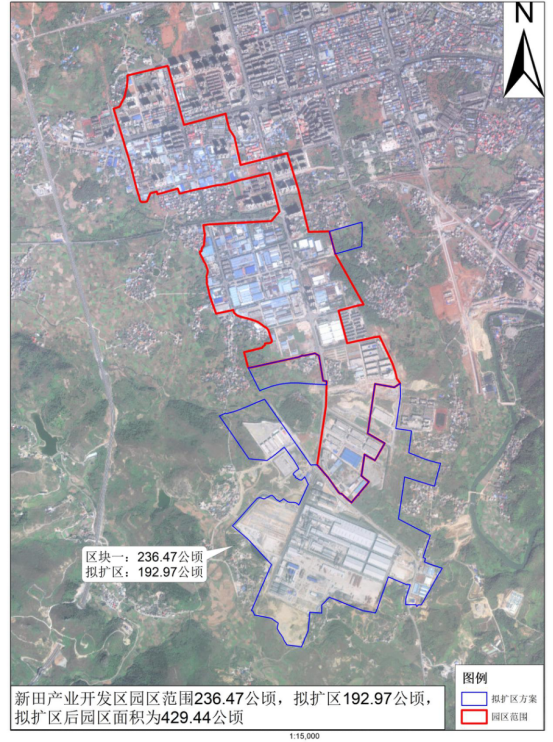 以湖南省发展和改革委员会《关于长沙天心经济开发区等29家园区调区的复函》(湘发改函〔2024〕64号)文件公布的新田产业开发区边界范围236.47公顷为基础,拟扩区面积192.97公顷,扩区后开发区面积为429.44公顷。其中: