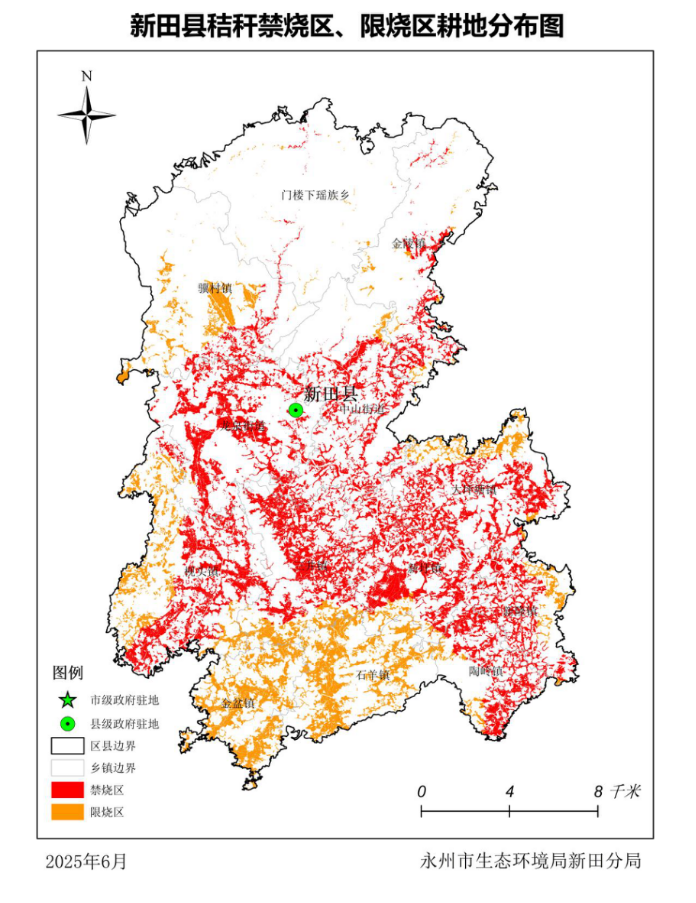 为科学有效地管控秸秆露天焚烧,切实减少露天焚烧农作物秸秆对环境空气质量的影响,保障人民群众生命财产安全。根据《中华人民共和国大气污染防治法》《湖南省大气污染防治条例》《湖南省秸秆综合利用若干规定》《湖南省秸秆禁烧区和限烧区划定的指导意见(试行)》等规定,现就划定新田县秸秆禁烧区和限烧区的有关事项通告如下。