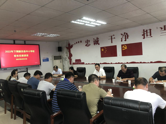 8月22日,新田县教育局召开2022年下期召开中小学新任校长任前廉政谈话会议。会议由教育局党组副书记、副局长陈国震主持,县纪委监委驻县教育局纪检组长肖霞,办公室主任肖付军、政工人事股股长刘国华、副股长乐勇以及九位新任校长参加了会议。