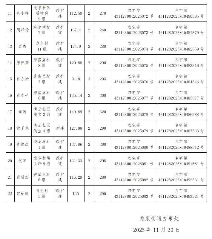新田县龙泉街道2025年11月农村宅基地和乡村建设规划许可批后公告