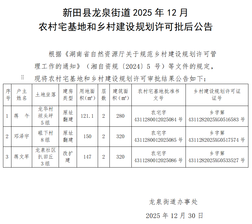 新田县龙泉街道2025年12月农村宅基地和乡村建设规划许可批后公告
