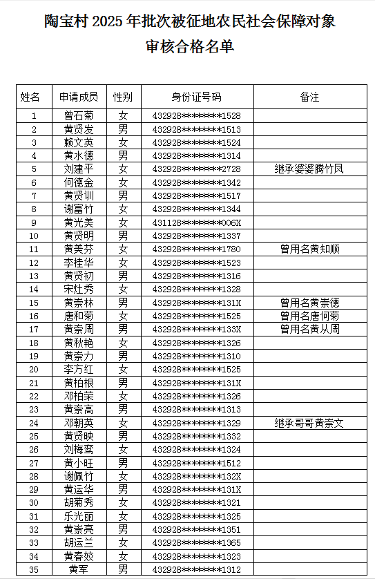 经相关部门审查,龙泉街道陶宝村下列人员纳入被征地农民社会保障对象认定范围。这些人员具备以下所有条件: