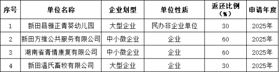 根据《人力资源社会保障部 财政部 税务总局关于延续实施失业保险稳岗惠民政策措施的通知》(人社部发〔2025〕18号)及《湖南省人力资源和社会保障厅办公室关于进一步做好失业保险稳岗返还经办工作的通知》(湘人社办函〔2024〕37号)要求,经审核,现对新田县2025年度第三批符合失业保险稳岗返还条件的4家单位予以公示。