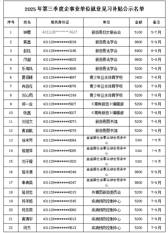 为加强我县就业见习补贴监督管理,根据《关于实施就业见习岗位募集计划的通知》,现将新田县2025年第三季度见习补贴人员名单(见附件)公示,公示期7天。如有异议请向新田县就业服务中心等相关部门反映情况。