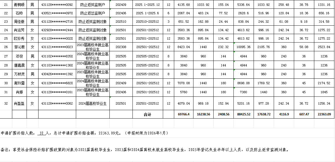根据《关于落实社会保险补贴扩围政策有关事项的通知》,现将新田县2025年12月份企业社保扩围补贴人员名单(见附件)公示,公示期7天。如有异议请向新田县就业服务中心等相关部门反映情况。