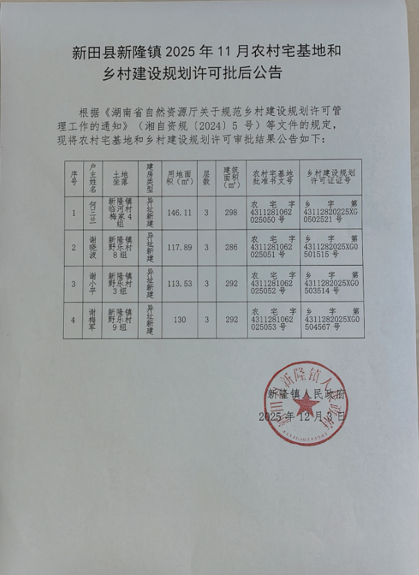 新田县新隆镇2025年11月农村宅基地和乡村建设规划许可批后公告