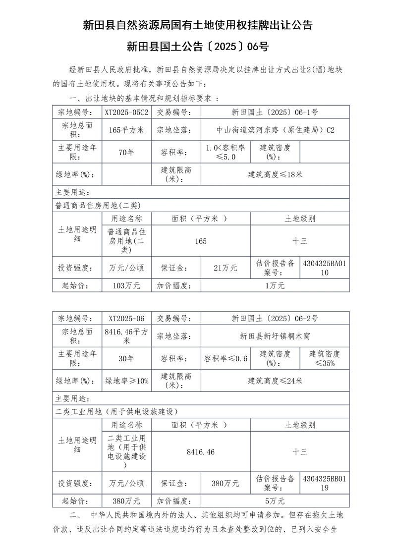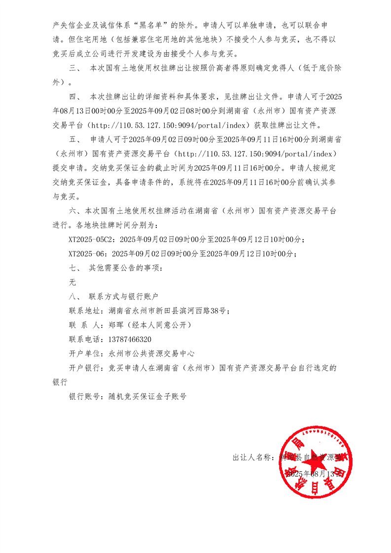 新田县自然资源局国有土地使用权挂牌出让公告新田县国土公告〔2025〕06号
