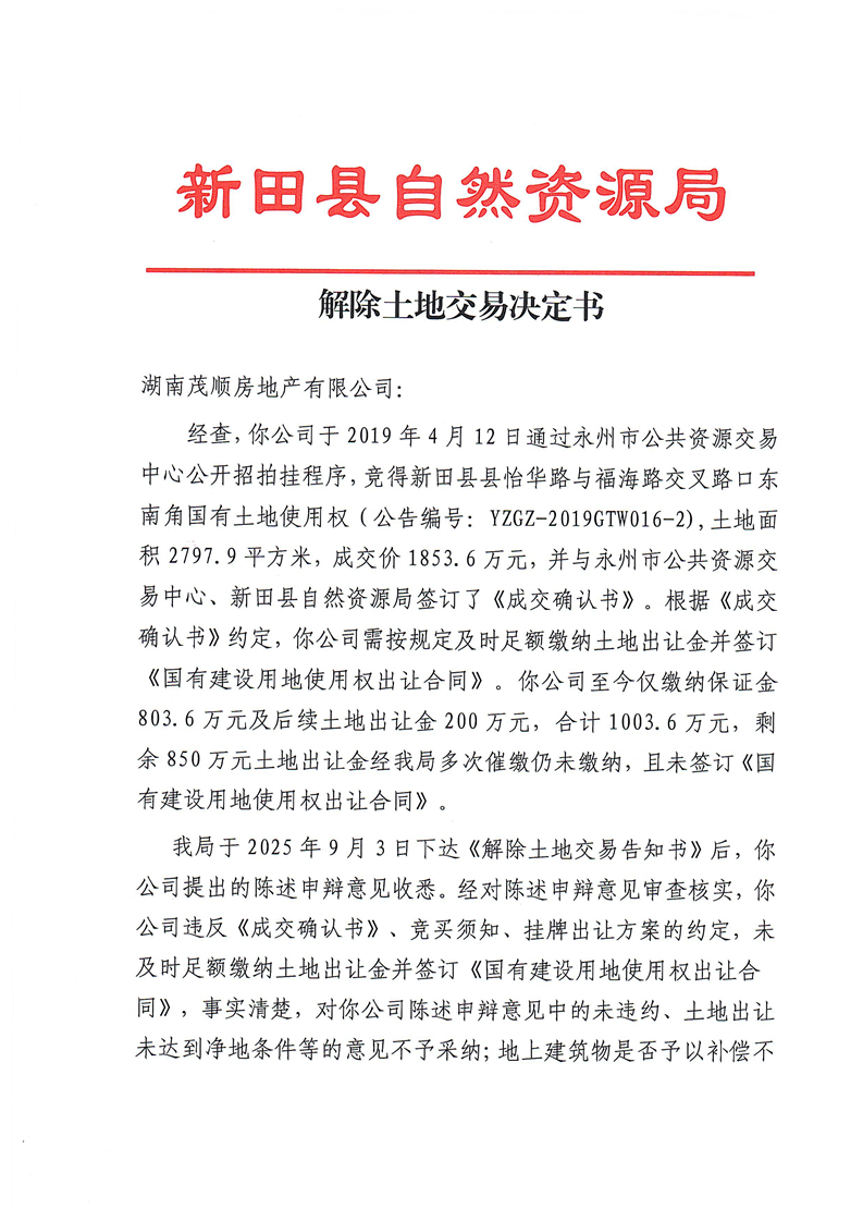 解除土地交易决定书(湖南茂顺房地产有限公司)