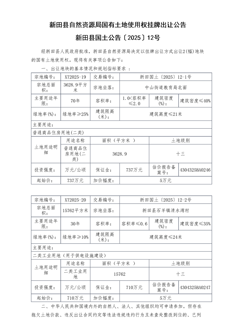 新田县自然资源局国有土地使用权挂牌出让公告新田县国土公告〔2025〕12号