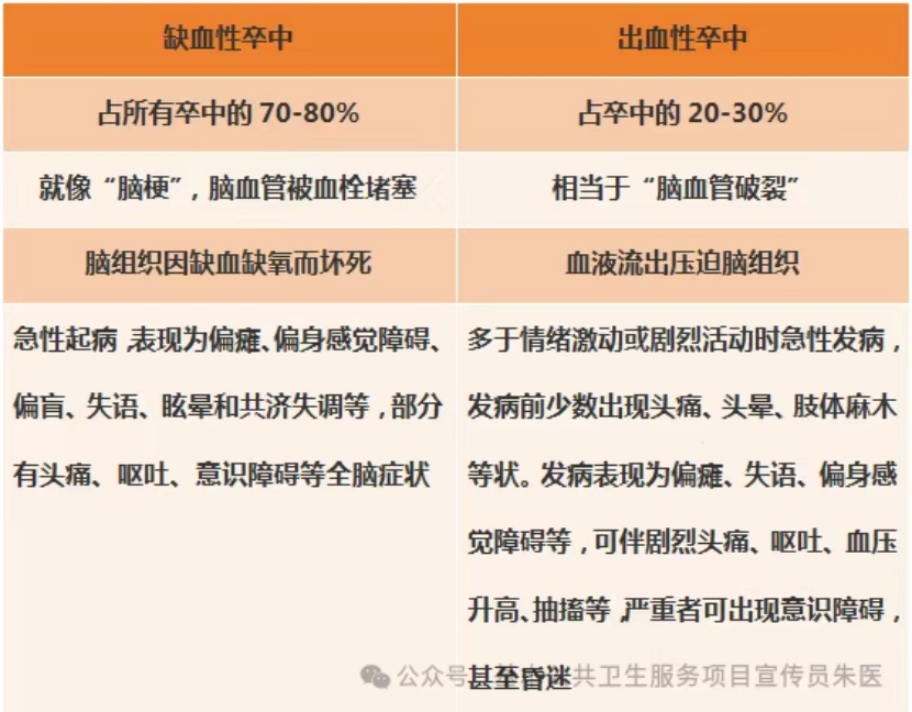 脑卒中,俗称中风,是脑血管在某一部位突然破裂或堵塞而引起的疾病,包括缺血性卒中和出血性卒中,缺血性卒中又称脑梗死,占卒中的85%,出血性卒中是因脑血管出血所致,占卒中的15%。大脑控制着整个身体,所以卒中的症状遍布全身。具体出现什么症状,取决于脑组织受损的部位。