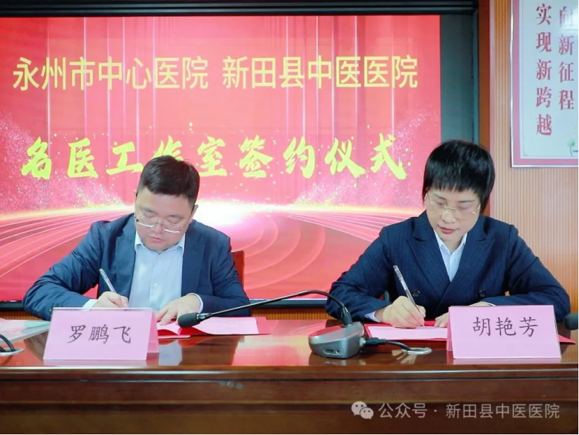 为深化医联体建设,推动优质医疗资源下沉,进一步提升县域医疗技术水平和服务能力,4月25日,我院与永州市中心医院正式签订“泌尿外科名医工作室”合作协议。永州市中心医院副院长罗鹏飞及名医工作室专家团队,新田县卫健局党组书记、局长周红霞,我院党委书记杨成、院长胡艳芳、党委委员、业务副院长黄远峰等领导出席签约仪式。