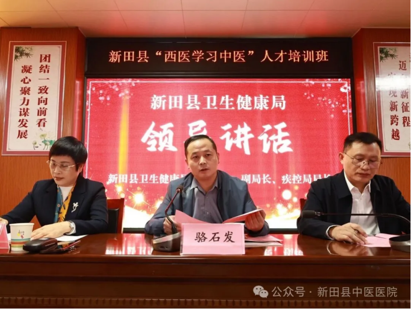 新田县卫健局党组成员、副局长、疾控局局长骆石发、新田县中医医院党委书记杨成、院长胡艳芳、新田县卫健局医政医管股股长郑平军等领导出席开班仪式并分别作了讲话。