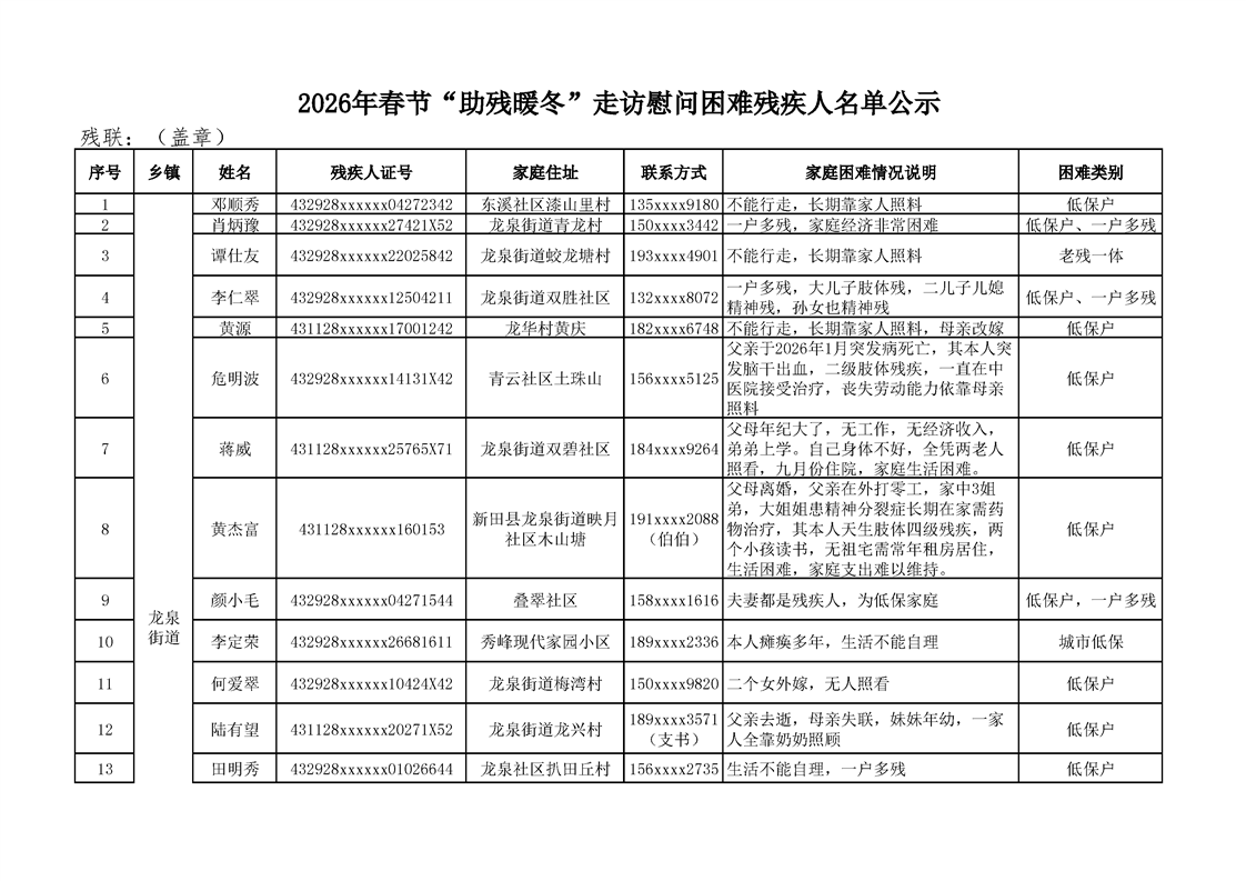 2026年春节“助残暖冬”走访慰问困难残疾人名单公示