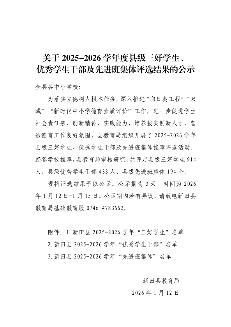 关于2025-2026学年度县级三好学生、优秀学生干部及先进班集体评选结果的公示