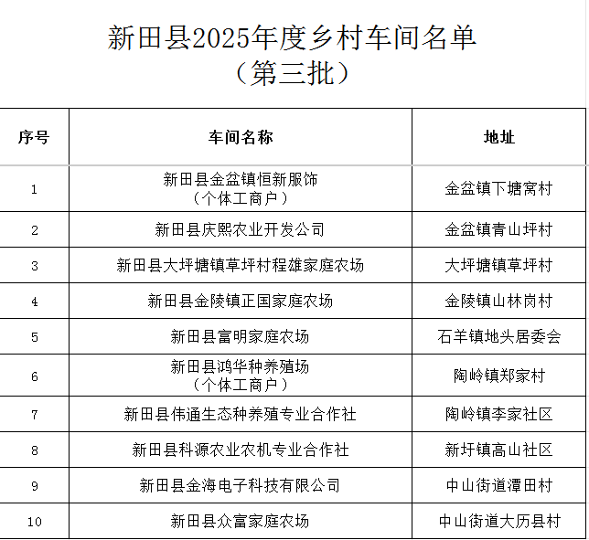 根据《巩固壮大就业帮扶车间促进就近就业的若干措施》(湘人社规〔2025〕3号)和《新田县巩固壮大就业帮扶车间促进就近就业的若干措施》(新人社联发〔2025〕6号)等文件精神,按照乡镇推荐的原则,经县财政局、县人社局、县农业农村局等部门联合实地调查核实,现拟认定新田县金盆镇恒新服饰(个体工商户)、新田县庆熙农业开发公司等10家企业(详细名单见附件)为新田县乡村车间,特予公示。