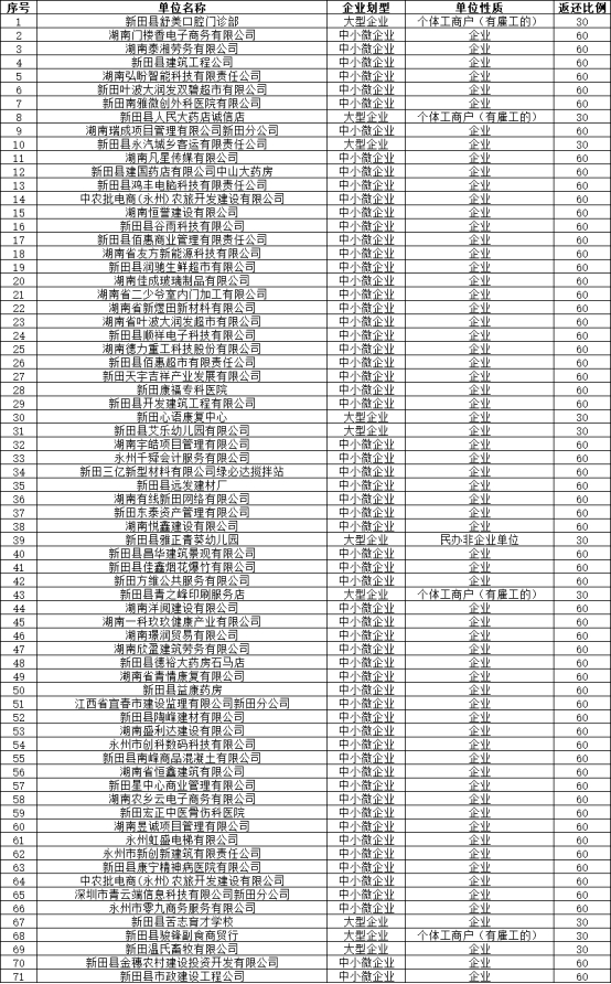 根据《湖南省人力资源和社会保障厅办公室关于进一步做好失业保险稳岗返还经办工作的通知》(湘人社办函〔2024〕37号)及《人力资源社会保障部 财政部 税务总局关于延续实施失业保险稳岗惠民政策措施的通知》(人社部发〔2025〕18号)文件精神,经审核,2025年度新田县第二批符合失业保险稳岗返还享受条件的单位共71家。现将71家享受稳岗返还单位名单拟于公示,公示期为2025年10月24日至10月31日。如有异议,请于公示期内向新田县就业服务中心失业保险股反映。