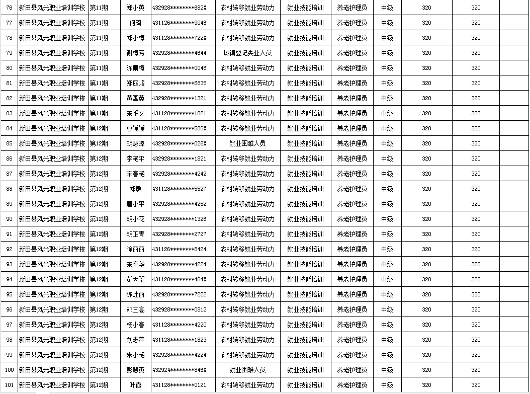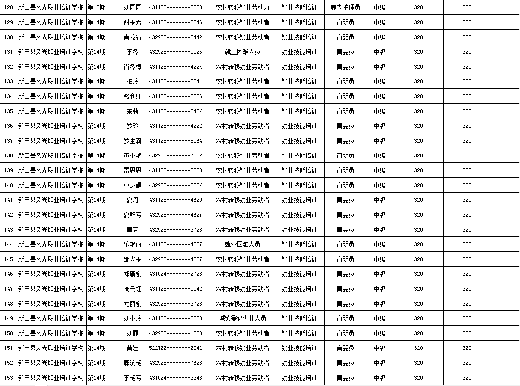 根据湖南省人社厅湖南省财政厅关于印发《湖南省职业技能培训补贴实施办法》的通知(湘人社规〔2024〕16号)、湖南省人社厅《关于公布我省职业技能鉴定收费标准的通知》(湘人社规〔2024〕3号)等文件的有关规定,现将2025年新田县风光职业培训学校第一批(第10、11、12、14期)职业技能鉴定(评价)补贴人员名单予以公示,公示期7天。如有异议请向新田县人社局就业促进与失业保险股等相关部门反映情况。公示期满无异议,补贴资金将按规定程序拨付到位。