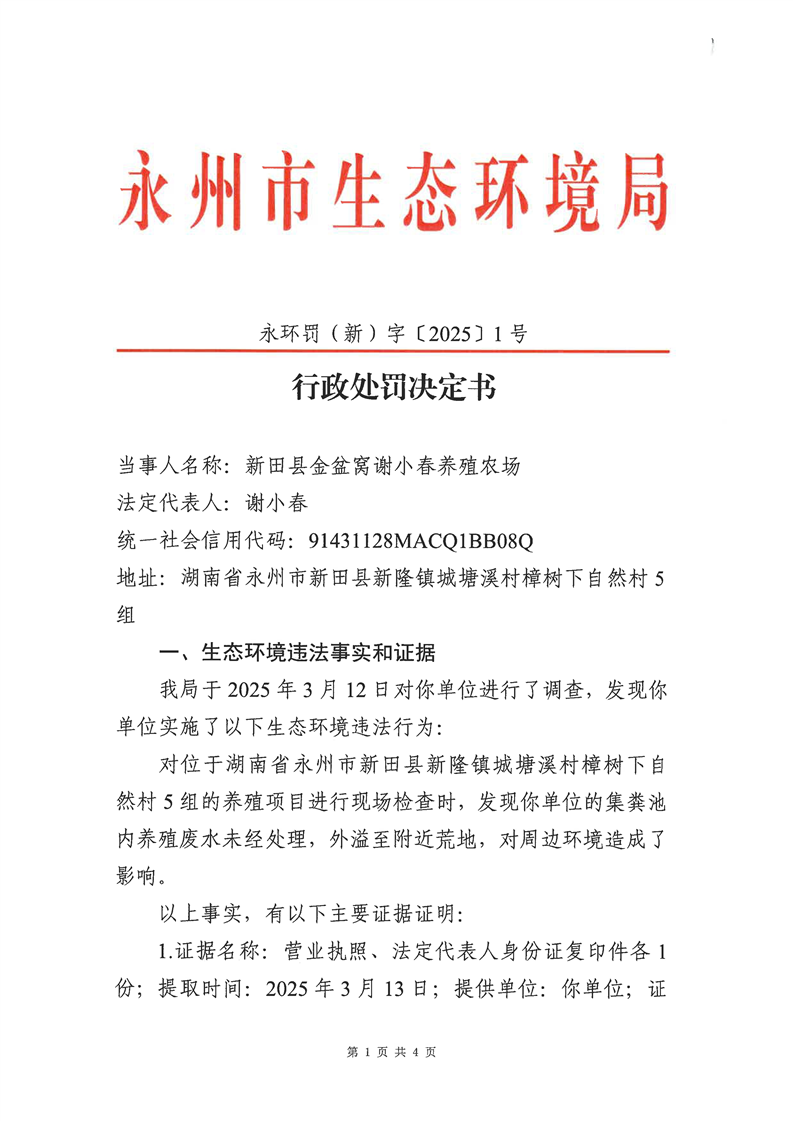新田县金盆窝谢小春养殖农场集粪池内养殖废水未经处理,外溢至附近荒地行政处罚决定书
