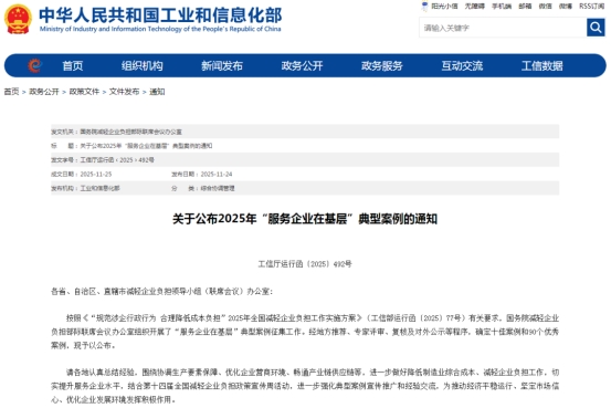 ▲ 工业和信息化部《关于公布2025年“服务企业在基层”典型案例的通知》